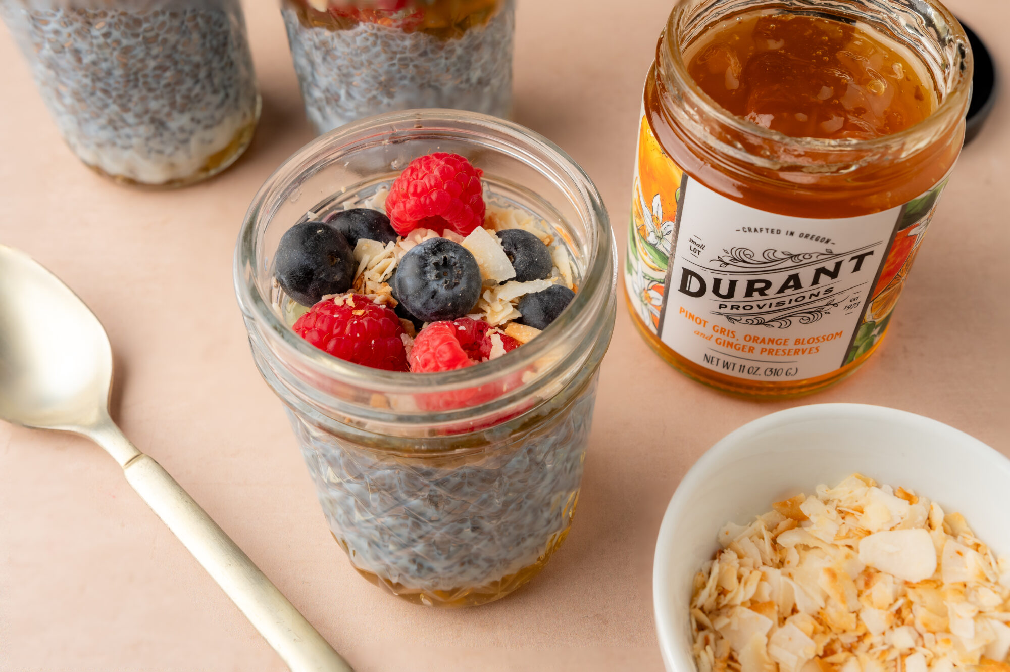 Simple prep-ahead breakfasts make mornings easier. Plus, they can double as afternoon snacks in a pinch. This chia pudding recipe serves double-duty, with a base of chia seeds and milk that chills and sets to form a creamy fiber-filled option that tastes like dessert. Layer the chia pudding with Durant’s Pinot Gris, Orange Blossom and Ginger Preserves for complex flavor, vibrancy, and a touch of sweetness. Top your chia pudding with fresh fruit and toasted coconut, add Greek yogurt, peanut butter or any other favorite topping before grabbing a spoon and digging in. Recipe courtesy of Molly Allen.