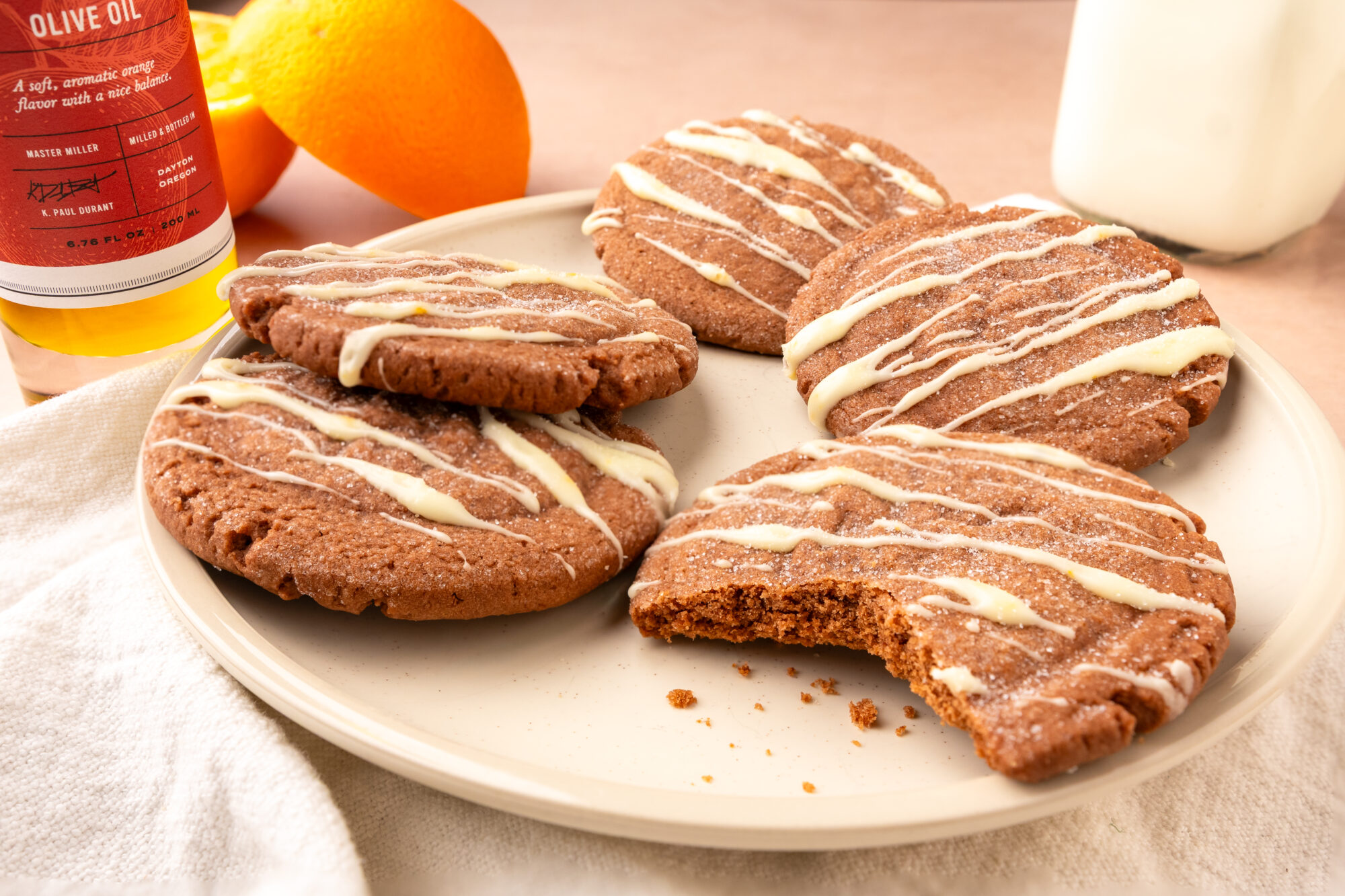 In a bowl, whisk together the powdered sugar, orange fused olive oil, and milk for the glaze. Drizzle the glaze over the cooled cookies and sprinkle with additional granulated sugar if desired. Store cookies in an airtight container.
